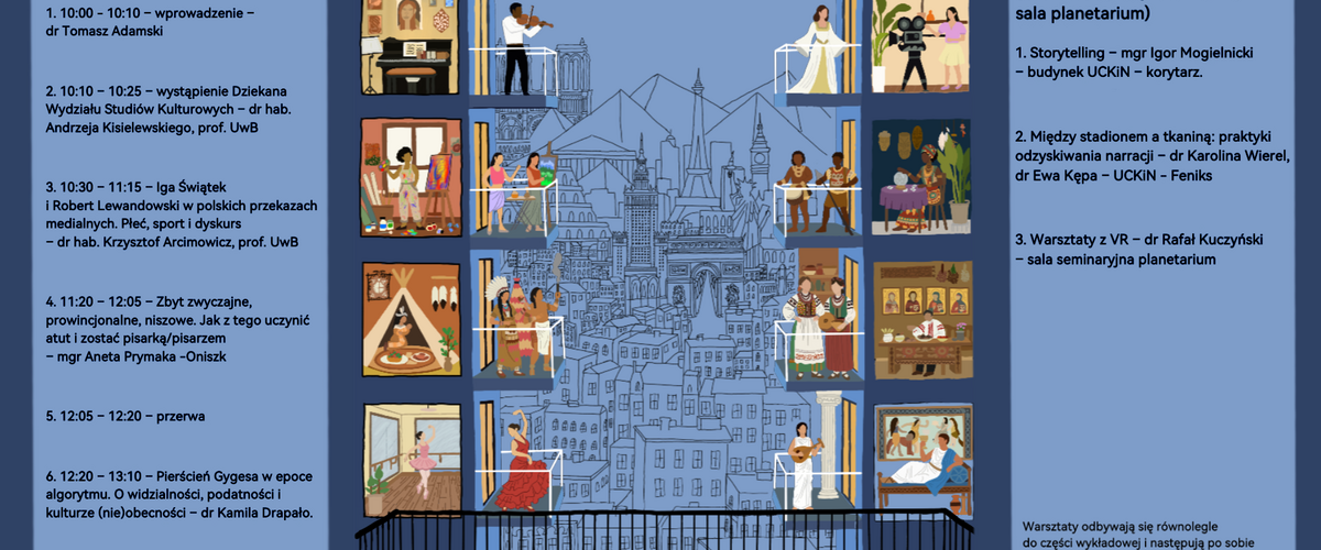 W programie znajdą się krótkie wykłady, inspirujące wystąpienia oraz warsztaty, przygotowane przez pracowników Wydziału Studiów Kulturowych Uniwersytetu w Białymstoku. Spotkania pokażą, jak w naszych badaniach łączymy refleksję teoretyczną z analizą współczesnych zjawisk kulturowych.
