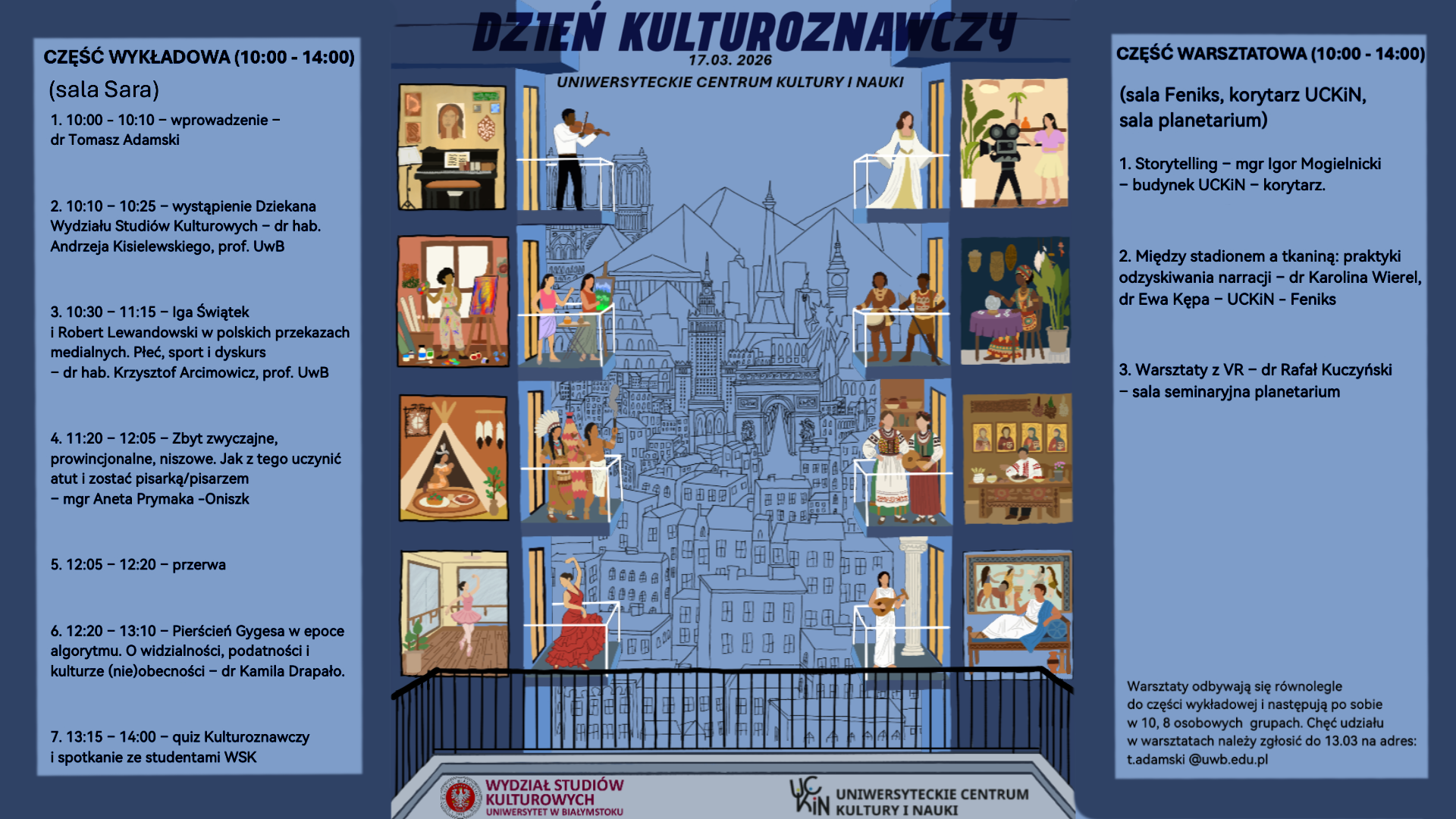 W programie znajdą się krótkie wykłady, inspirujące wystąpienia oraz warsztaty, przygotowane przez pracowników Wydziału Studiów Kulturowych Uniwersytetu w Białymstoku. Spotkania pokażą, jak w naszych badaniach łączymy refleksję teoretyczną z analizą współczesnych zjawisk kulturowych.
